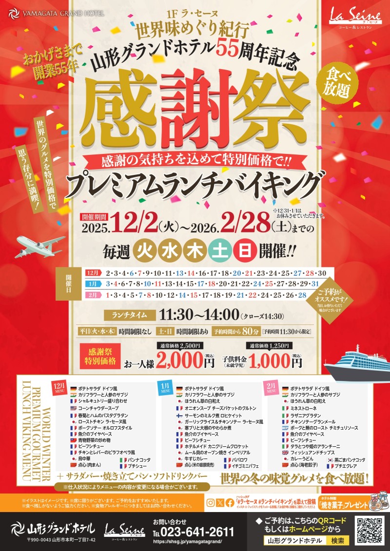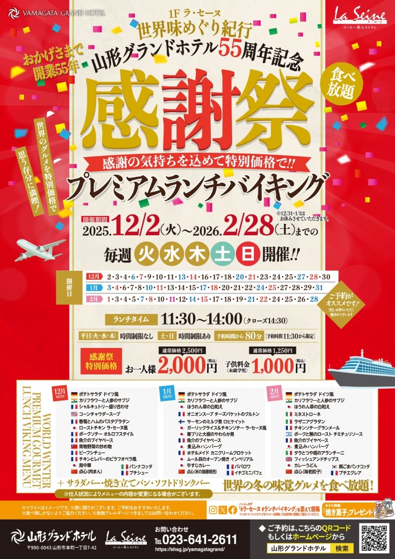 「世界味めぐり紀行 山形グランドホテル55周年記念感謝祭 プレミアムランチバイキング」 を開催いたします。